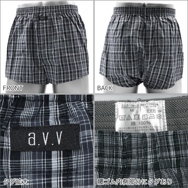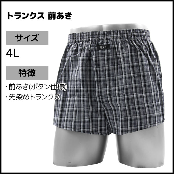 綿100%のやさしい着心地。カジュアルながらもシンプルな色合いのメンズトランクスです。●商品特性:アウトレット品・前あき(ボタン仕様)・先染めトランクス ●素材:綿100%